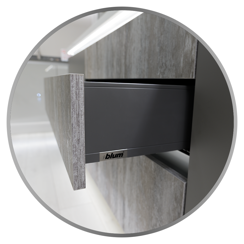 BlumⓇ LEGRABOX soft close drawer system with a 16mm solid base and back panel; as standard.